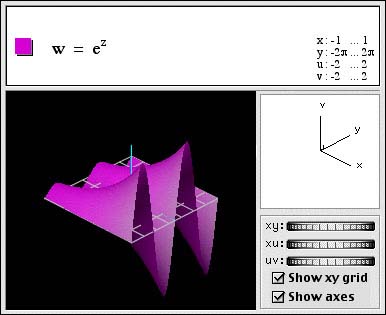 A function of a complex variable represents a 2-manifold embedded in four dimensions. Here, the white grid is the z = x + iy complex plane. The function w = ez, or u + iv = ex + iy is projected from four-dimensional (x,y,u,v) space to the screen, in a similar same way a 3D image is projected onto a 2D picture. This projection shows the imaginary part of ex + iy = ex(cos y + i sin y). One can see both the sinusoidal variation with y and the exponential variation with x in this view.