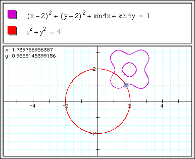 Just click on the graph to numerically solve for zeros and intersections. Graphing Calculator will find any intersections between 2D curves. This example shows Graphing Calculator snapping to an intersection between two implicitly defined curves. It will find intersections and zeros for curves defined parametrically and explicitly as well.